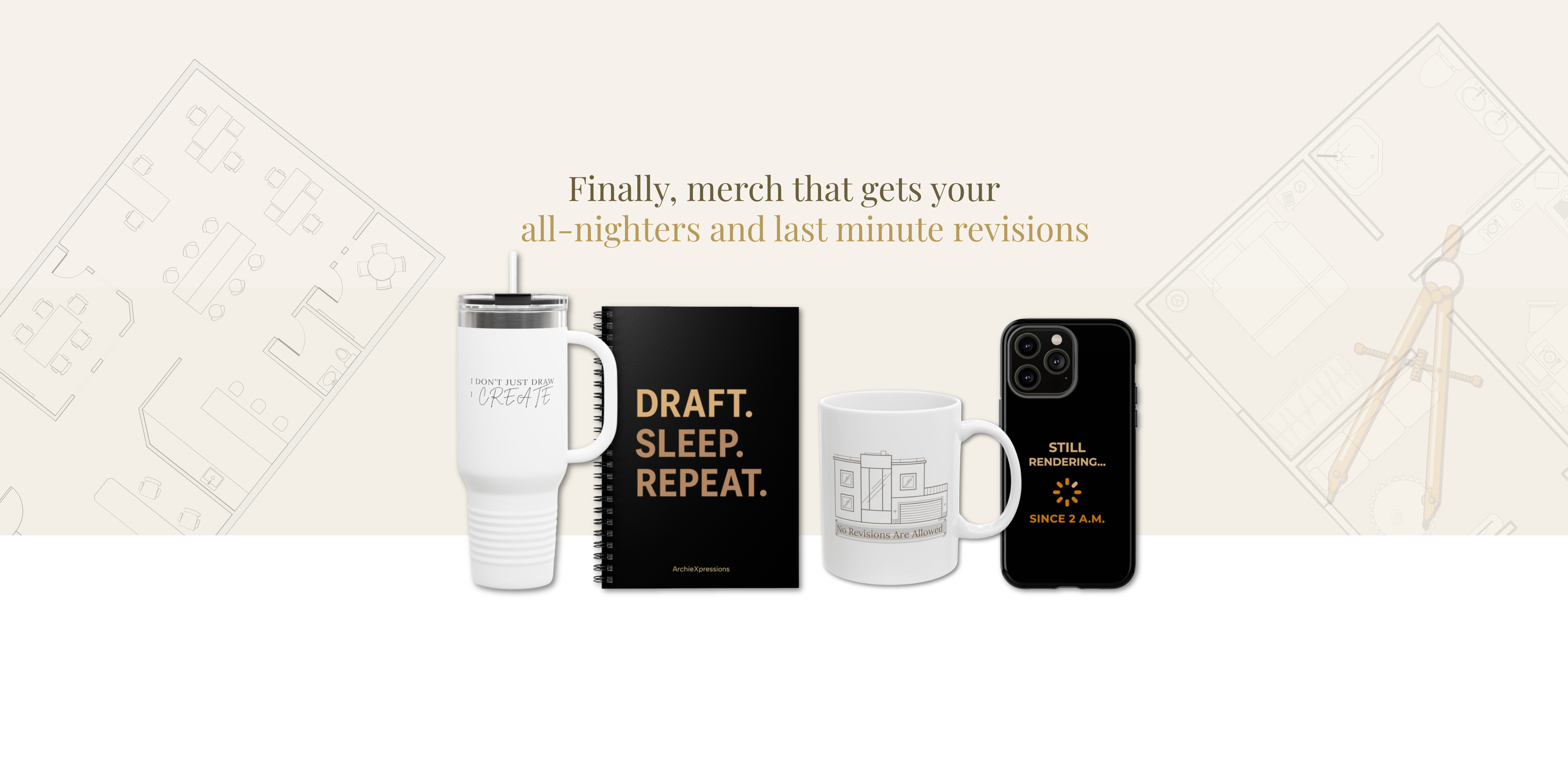 We offer thoughtfully designed essentials—tumblers, coffee mugs, phone cases, tote bags, notebooks, and apparel—made to fit seamlessly into studio life. Whether you’re heading to class, pulling an all-nighter, or prepping for critique, Archiexpressions is here to remind you that you’re not alone—and that it’s okay to laugh along the way.